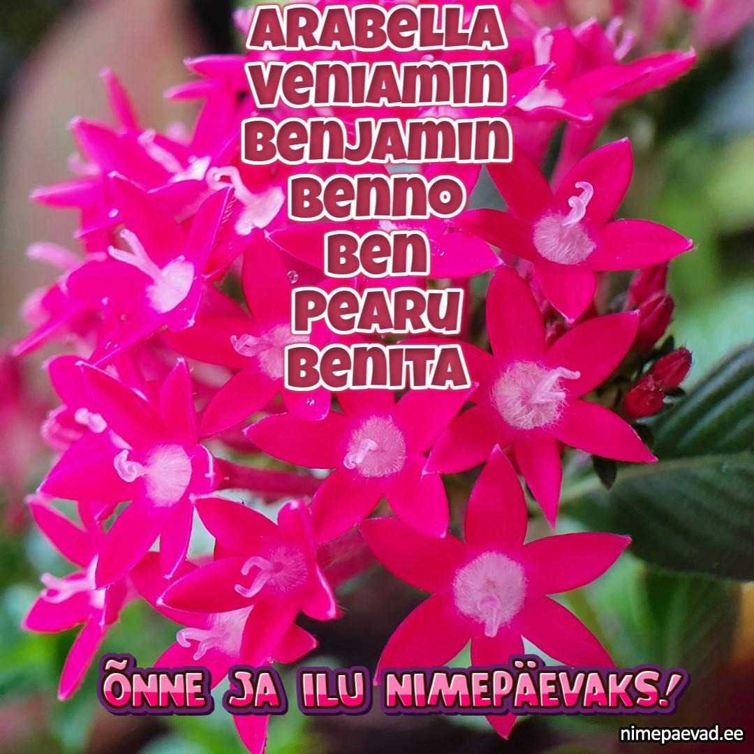 Arabella, Veniamin, Benjamin, Benno, Ben, Pearu, Benita, Bernhard, Arabel, Päären, Pääru, Päärn, Bennet, Bernard, Birger, Venjamin, Bernd, Bengt, Päär, Berni, Pear, Benedict, Benedikt, Bente, Istvan, Pearn, Pärn, Pärni, Pärno, Pääro