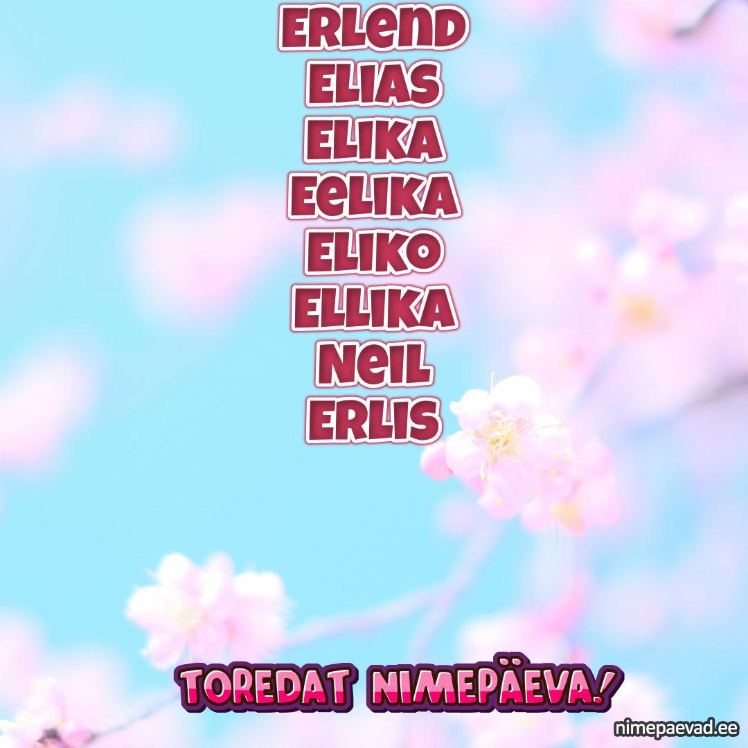 Erlend, Elias, Elika, Eelika, Eliko, Ellika, Neil, Erlis, Heliko, Erland, Erling, Geelia, Erlanda, Degla, Elia, Ellike, Ellis, Erlin, Erlyn, Liias