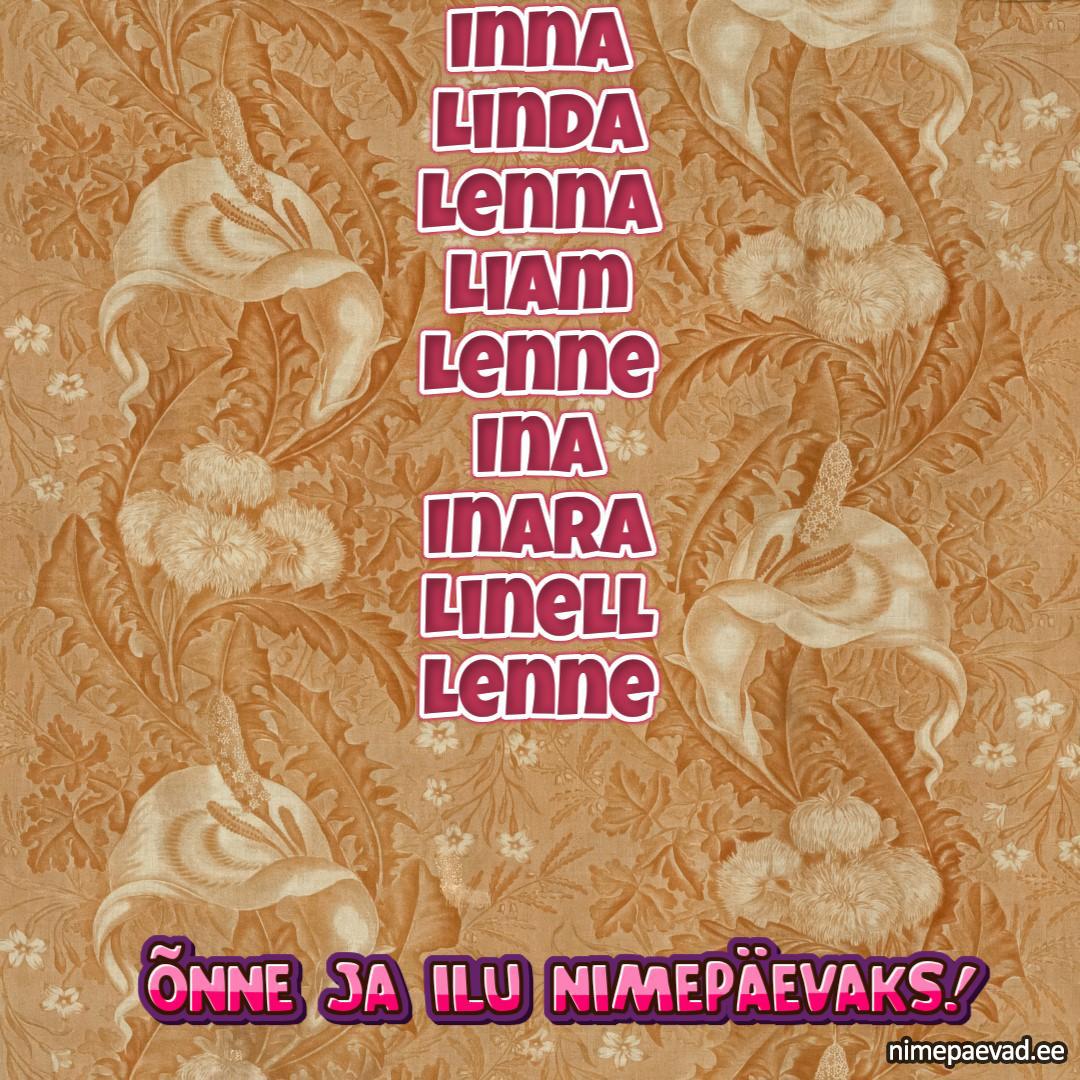 Inna, Linda, Lenna, Liam, Lenne, Ina, Inara, Linell, Lenneli, Inda, Inta, Lende, Indira, Guillermo, Inne, Solomon, Iina, Indi, Eros, Hinna, Indur, Inita, Indra, Limara