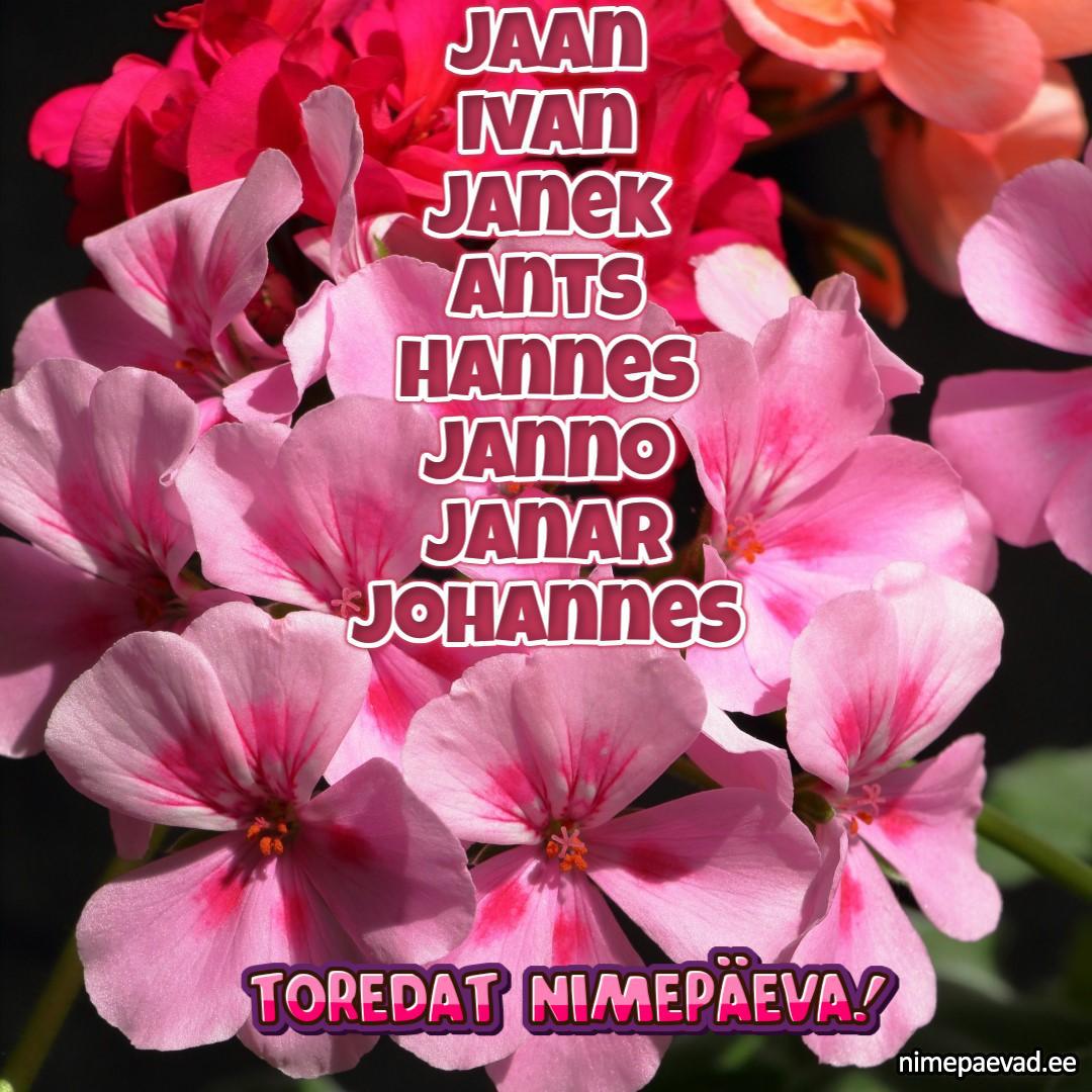 Jaan, Ivan, Janek, Ants, Hannes, Janno, Janar, Johannes, Juhan, Jan, Hans, Janis, Johan, Johann, Jaanis, Janari, Juss, Jaanek, Jan-Erik, Annes, Ian, Juho, Hans-Kristjan, Juhani, Žan, Jander, Juku, Giovanni, Juha, Hants, Juhannes, Janre, Jandre, Jann, Ioann, Jean, Jannu, Juan, Hans-Erik, Jan-Eerik, Janko, Janter, Jaan-Eerik, Jaan-Erik, Janeck, Janri, Johannes-Markus, Giulio, Jannes, Jukko, Ants-Kristjan, Kris-Jan, Canet, Giovanna, Jaanes, Janeikko, Jukk, Juks, Junko, Kanek, Ants-Gregor, Sten-Janari