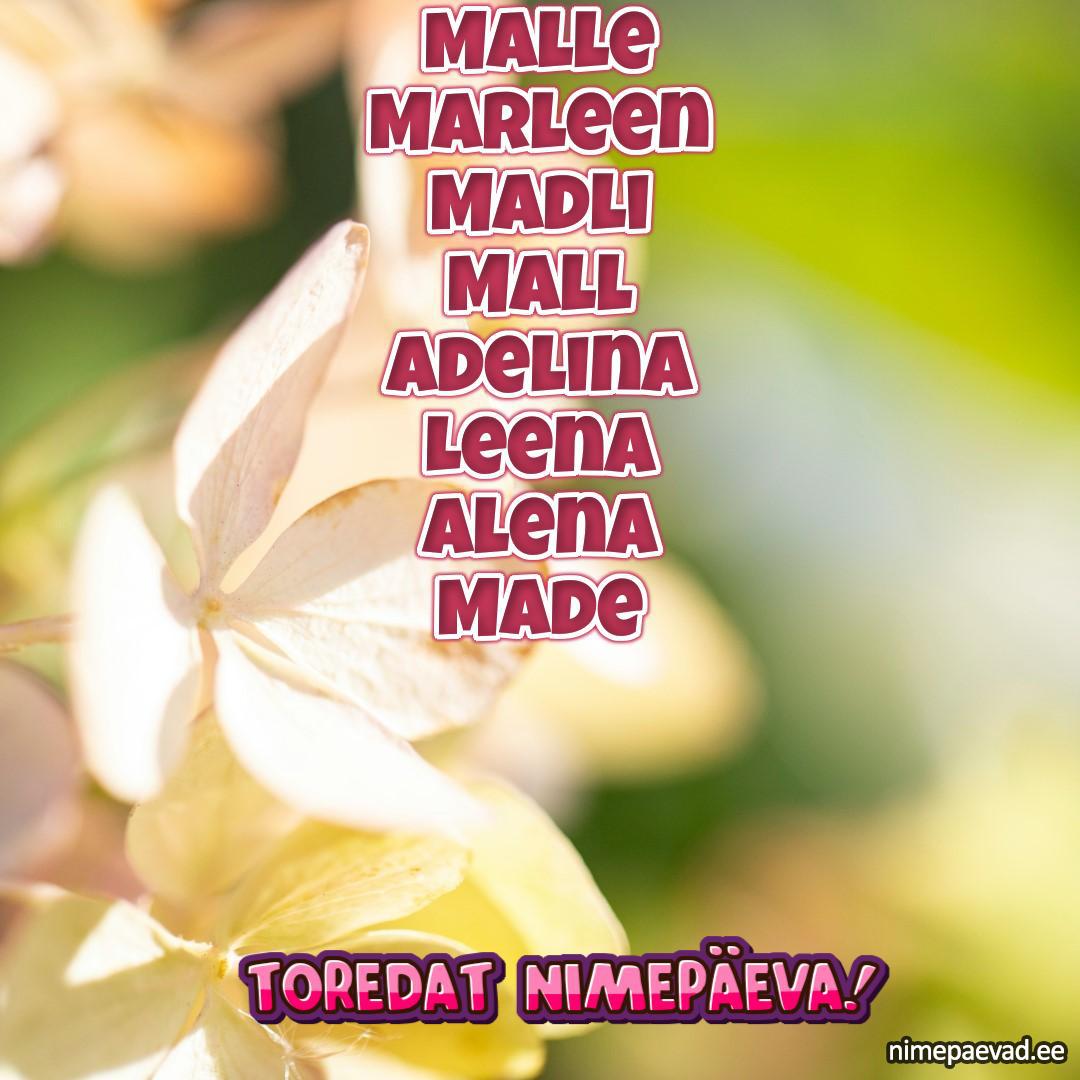 Malle, Marleen, Madli, Mall, Adelina, Leena, Alena, Made, Adelia, Leeni, Lena, Madleen, Magda, Marlene, Leen, Alana, Malika, Magdalena, Leene, Mari-Leen, Leenu, Lene, Madina, Adeliine, Adeline, Lesja, Madle, Marlee, Adeliina, Madelin, Madeleine, Marleene, Adelle, Ave-Marleen, Magdaleena, Malik, Adeelia, Malin, Lily-Marleen, Magne, Malena, Midli, Lenka, Adeliise, Adelise, Adelya, Adelyn, Adelyne, Lenel, Madek, Madeline, Maggie, Malory, Marleena, Marlen, Marleyn, Helis-Marlen, Marleyn-Cristin, Rety-Adelyn, Rosaly-Marleen