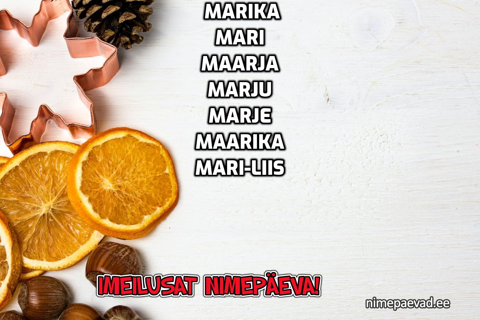 Maria, Marika, Mari, Maarja, Marju, Marje, Maarika, Mari-Liis, Mariia, Mariliis, Marie, Marija, Marii, Anna-Maria, Marili, Marilin, Marat, Mari-Ann, Eva-Maria, Maarja-Liis, Marja, Marilyn, Mariya, Anne-Mari, Marily, Hanna-Maria, Maarja-Liisa, Marja-Liisa, Mari-Anne, Liis-Marii, Mary, Marilis, Liisa-Maria, Marliis, Mari-Ly, Ann-Marii, Marike, Mari-Leen, Maari, Mairika, Maaria, Maria-Liisa, Marfa, Maina, Mariken, Mari-Anna, Marilii, Mara, Eeva-Maria, Maritana, Manni, Marlis, Mariliin, Marjen, Marjete, Marjo, Maini, Mariika, Marjaliisa, Marjeta, Marjut, Marri, Ann-Mari, Mariah, Mariett, Anne-Marii, Maarjaliis, Mann, Mariet, Marilen, Õnne-Mari, Marica, Marya, Liis-Mari, Mane, Mariica, Mariko, Marisol, Anette-Maria, Lisete-Maria, Liste-Maria, Mari-Janne, Maria-Ly, Marie-Liise, Mary-Helena, Mary-Ly, Minna-Marie, Sabrina-Maria, Sarah-Maria
