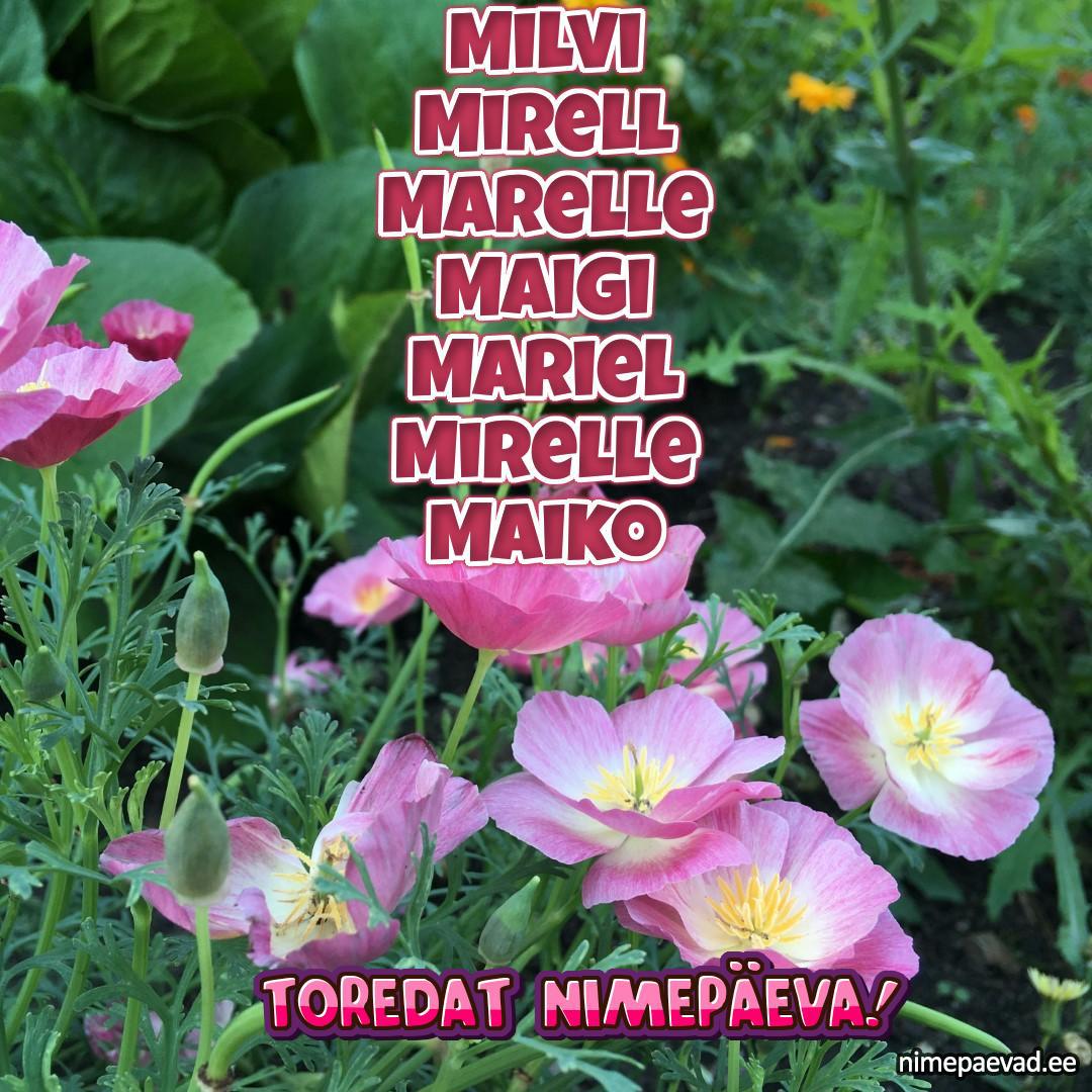 2. juulil on nimepäev: Milvi, Mirell, Marelle, Maigi, Mariel, Mirelle, Maiko, Marielle, Maik, Mariell, Maiga, Mirel, Maige, Mia-Mirell, Mariella, Merelle, Mirete, Mareli, Maigo, Mireli, Mirella, Marell, Marella, Mariela, Mirit, Mirette, Marely, Milve, Mirely, Maikko, Miret, Maigar, Maivo, Mirelia, Marijola, Mariola, Milvy, Mirith, Myrell, Mirete-Ly
