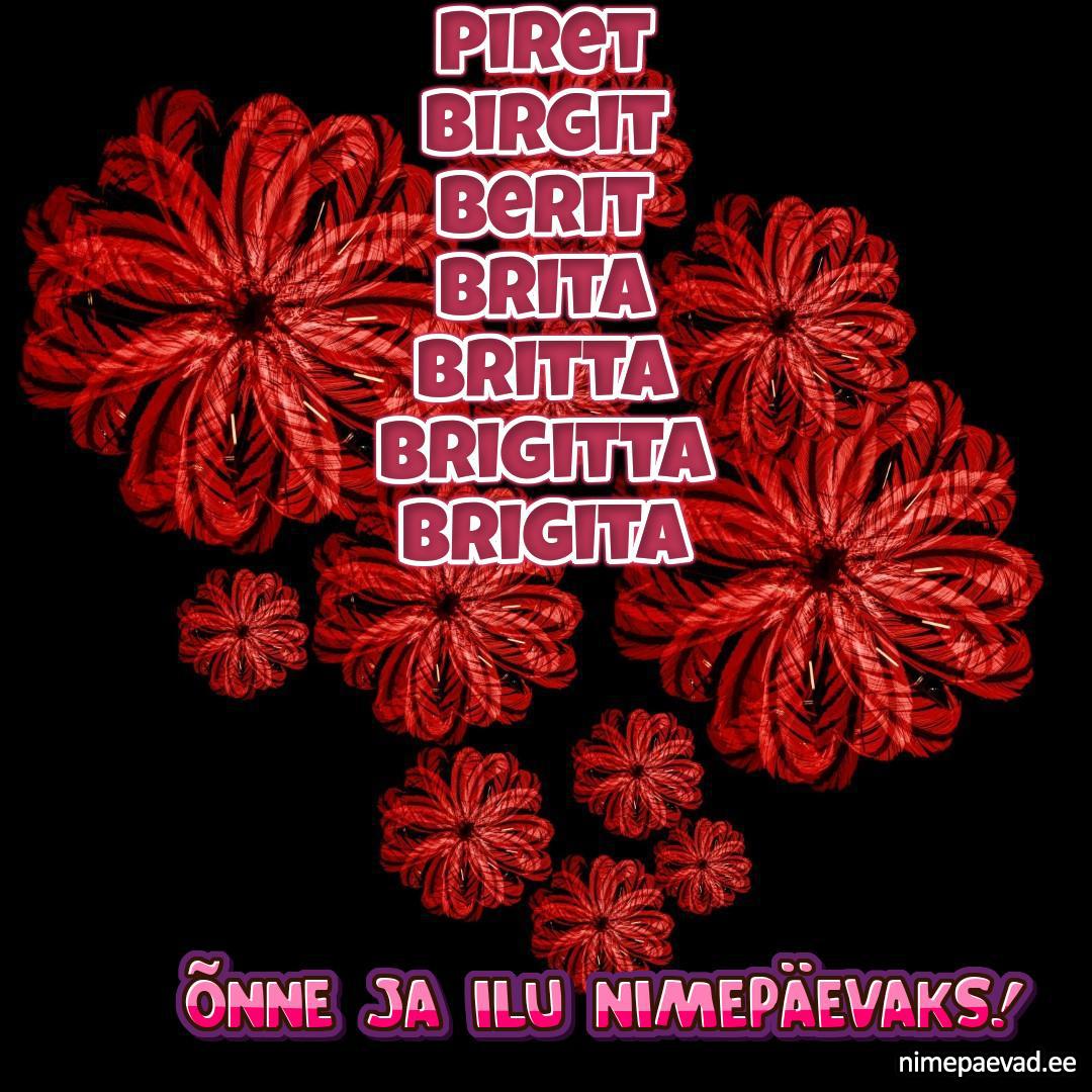 Piret, Birgit, Berit, Brita, Britta, Brigitta, Brigita, Brianna, Brit, Britt, Pirjo, Pirgit, Pirje, Gita, Britten, Brigitte, Birgitta, Birgita, Brigite, Brett, Birjo, Britte, Birgith, Brigit, Brittany, Brite, Bret, Briana, Pirke, Birte, Brigitha, Britha, Pirko, Birge, Brianne, Brith, Brigitt, Pirja, Birgitt, Birgot, Birje, Bridget, Brigily, Piirka, Pireta, Pirkit, Pirkko, Pirtel, Prita, Pirre