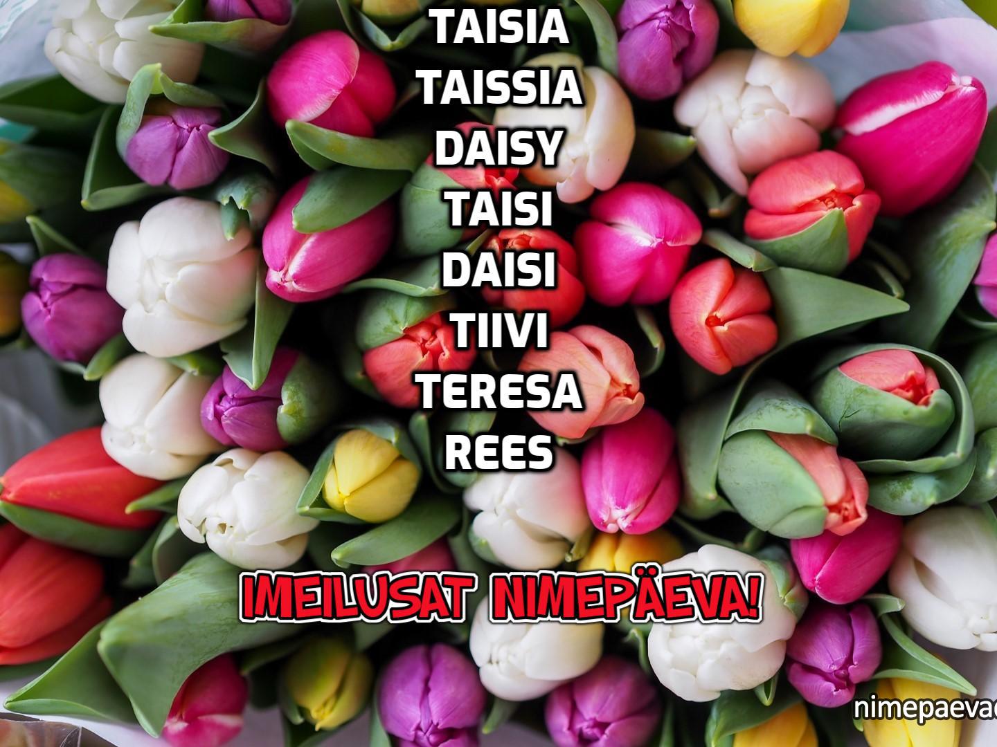 26. aprillil on nimepäev: Taisia, Taissia, Daisy, Taisi, Daisi, Tiivi, Teresa, Reesi, Taisija, Tessa, Therese, Tereza, Theresa, Deisy, Teisi, Deisi, Teesi, Eesi, Teili, Tereese, Tess, Eisi, Terttu, Teisy, Terese, Heisi, Deevi, Deivi, Deyvi, Teevi, Teivi, Tereesa, Terri, Terry, Teve, Daisy-Tairy